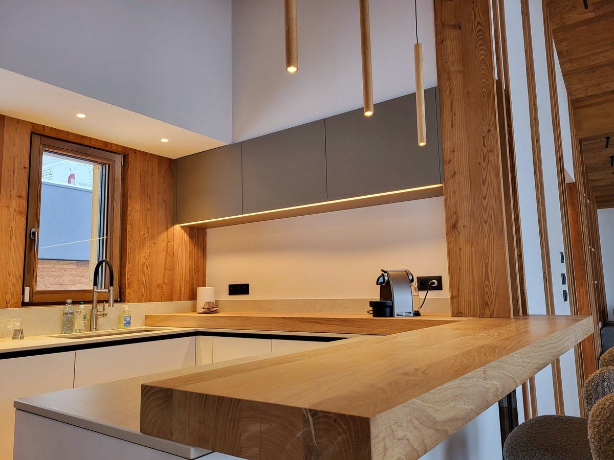 Située à Chamonix, la maison Houche 1 incarne la fusion parfaite entre design alpin moderne et tradition artisanale. Ce chalet haut de gamme a été conçu avec soin par Atelier Matières, menuiserie basée à Lyon, reconnue pour la précision de ses agencements sur mesure en bois massif. Chaque espace, de la cuisine à la chambre, respire l’élégance, la fonctionnalité et le savoir-faire français.
