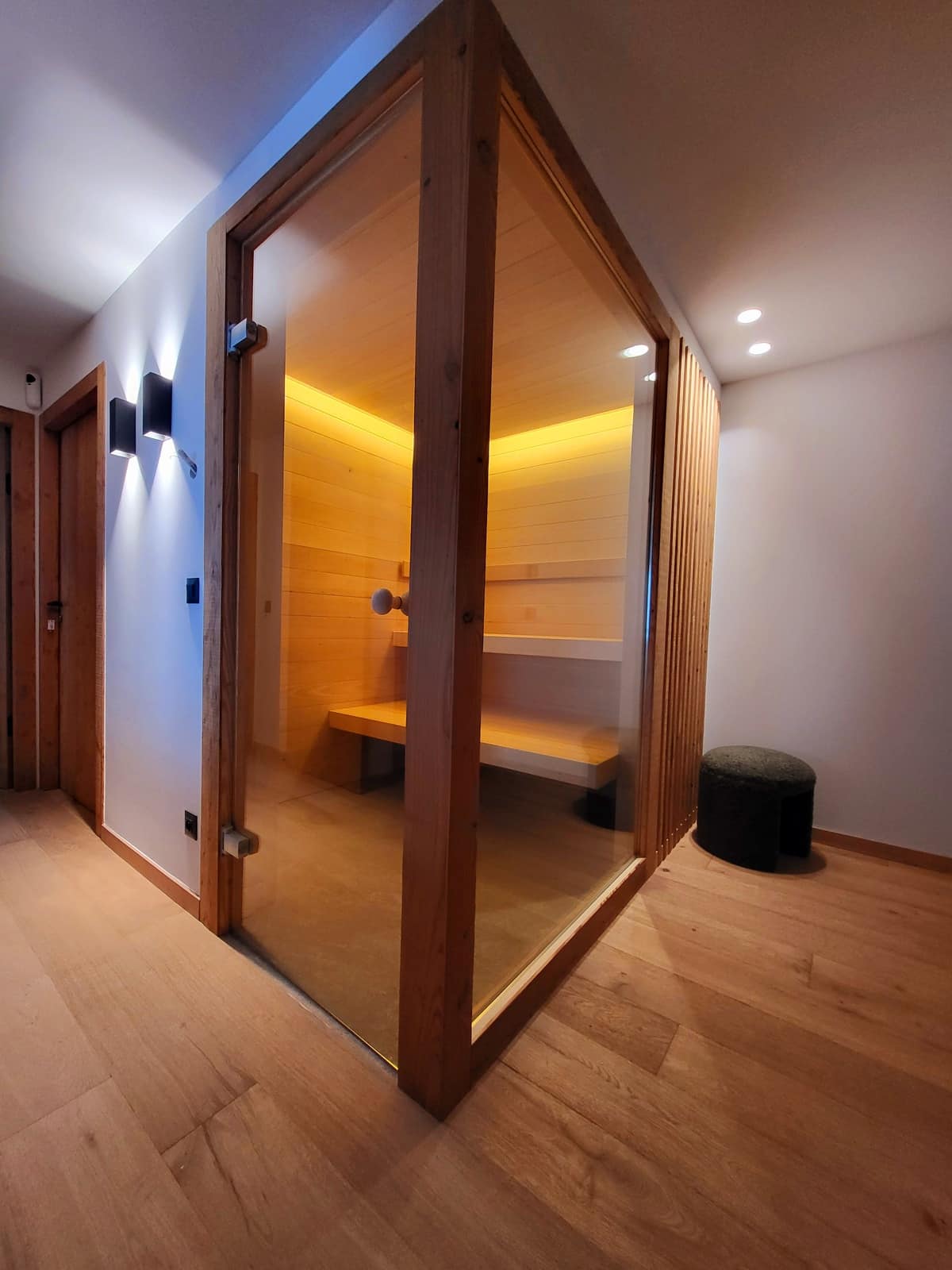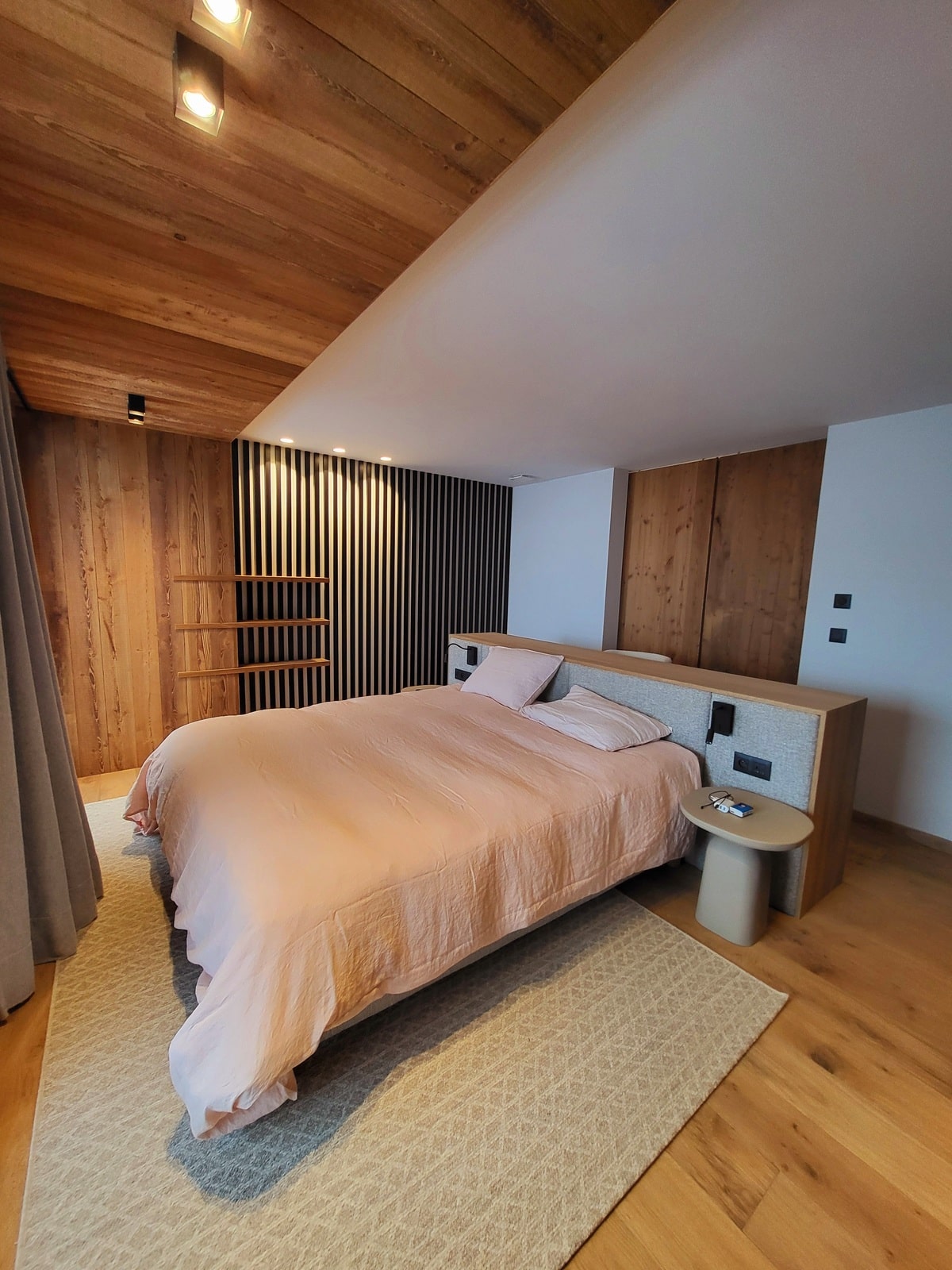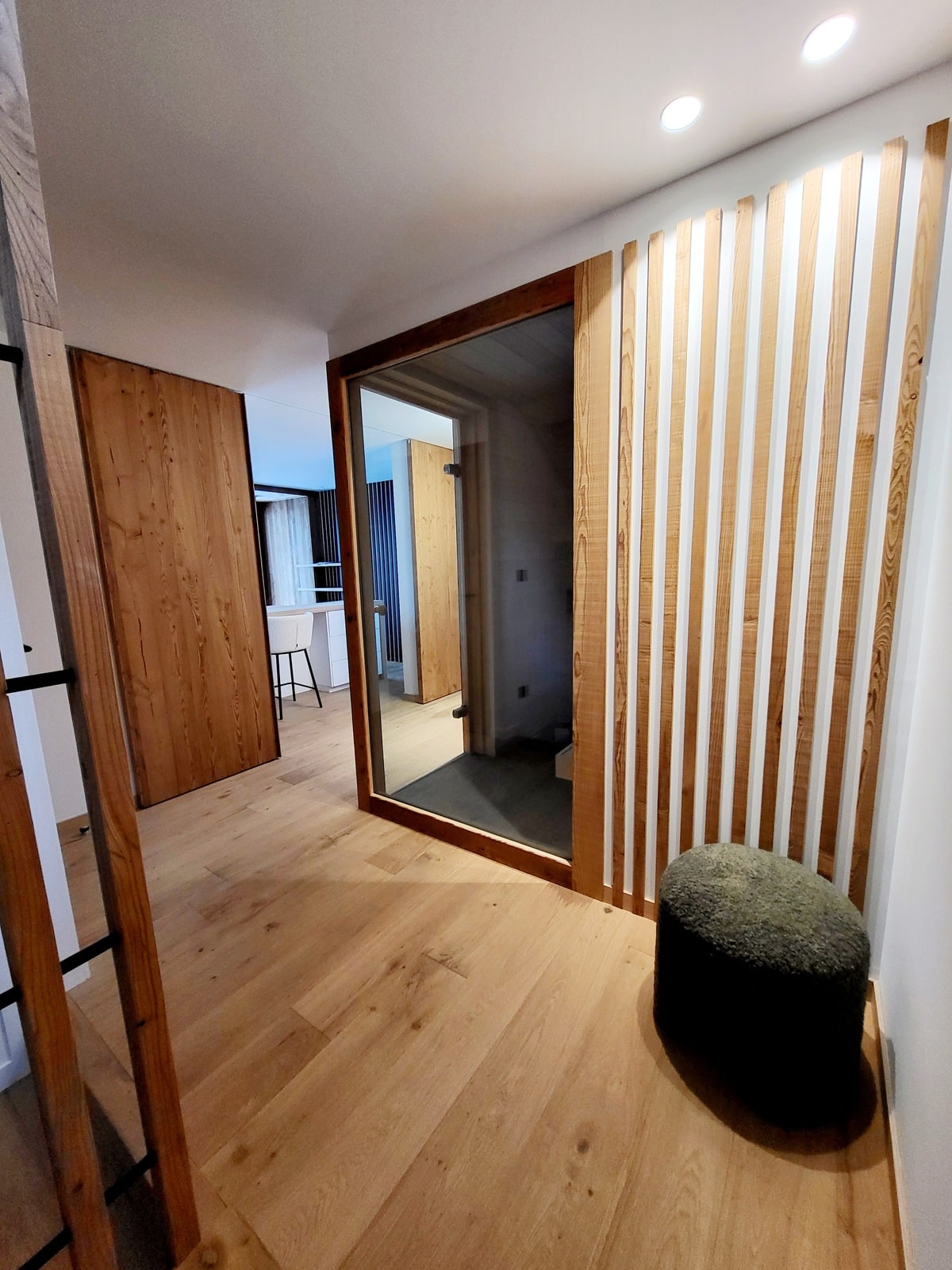 Chambre sur mesure avec alcôve, cuisine élégante mêlant bois et surfaces contemporaines, sauna vitré ou encore salle de bain boisée : chaque pièce illustre la capacité d’Atelier Matières à conjuguer esthétique et fonctionnalité. Le choix du bois massif s’harmonise ici avec des tons sobres et des lignes pures pour une ambiance cocooning et moderne à la fois.